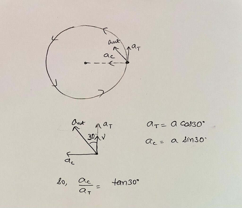 A point on the periphery of rotating disc has its acceleration vector making on angle 30° with velocity vector then the ratio of magnitude of centripetal acceleration to tangential acceleration is :