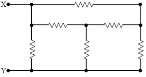 Six resistors each of 10 W are connected as shown. The equivalent resistance between points X and Y is :