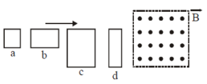 through a region of uniform magnetic field \[\overrightarrow{B}\] (directed out of the page) at the same constant velocity. Rank the four loops according to the maximum magnitude of the e.m.f induced as they move through the field, greatest first :-