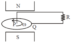A metal disc rotates freely, between the poles of a magnet in the direction indicated. Brushes P and Q make contact with the edge of the disc and the metal axle.What current, if any, flows through R?