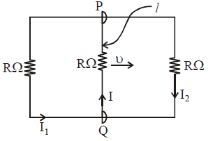 A rectangular loop has a sliding connector PQ of length l and resistance RΩ and it is moving with a speed v as shown. The set-up is placed in a uniform magnetic field going into the plane of the paper. The three currents I1, I2 and I are