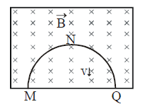 Select the correct alternative. A thin semicircular conducting ring of radius R is falling with its plane vertical in a horizontal magnetic induction \[\overrightarrow{B}\] . At the position MNQ the speed of the ring is v & the potential difference developed across the ring is :
