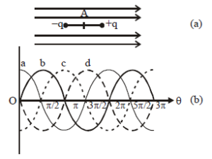 Question 5: The electric dipole is situated in an electric field as shown in figure. The dipole and electric field are both in the plane of paper. The dipole is rotated about an axis perpendicular to the paper at point A in anticlockwise direction. If the angle of rotation is measured with respect to the direction of the electric field then the torque for different values of the angle of rotation θ will be as represented in figure :
