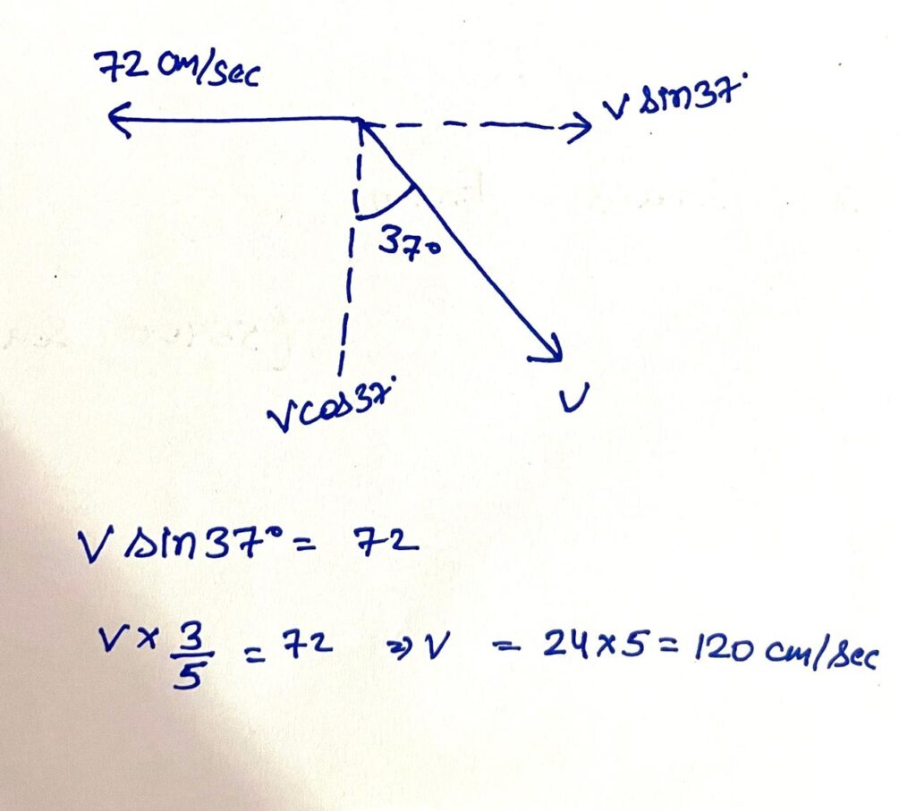 A man walks in rain at 72 cm/s due east and observes the rain falling vertically. When he stops, rain appears to strikes his back at 37º from the vertical. Find velocity of raindrops relative to the ground.