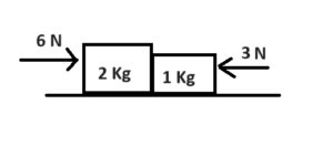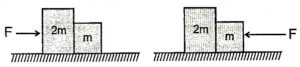 Two blocks are in contact on a frictionless table. One has mass m and the other 2 m. A force F is applied on 2 m as shown in the figure. Now the same force F is applied from the right on m. In the two cases respectively, the ratio of force of contact between the two blocks will be: