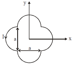 A loop carrying current I lies in the x–y plane as shown in the figure. The unit vector ˆk is coming out of the plane of the paper. The magnetic moment of the current loop is :-