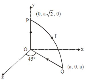 As shown in the figure, the radius of each of quarter circular arc is 2m. Find the magnetic moment of the given loop for the current in the loop :