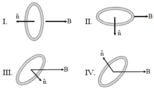 A current carrying loop is placed in a uniform magnetic field in four different orientations, I, II,