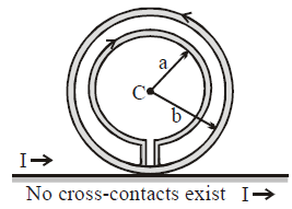 An otherwise infinite, straight wire has two concentric loops of radii a and b carrying equal
