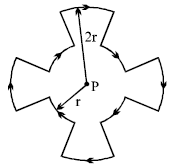 A current I flows around a closed path in the horizontal plane of the circle as shown in the figure. The path consists of eight arcs with alternating radii r and 2r. Each segment of arc subtends equal angle at the common centre P. The magnetic field produced by current path at point P is
