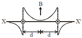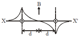 Two long parallel wires are at a distance 2d apart. The carry steady equal current flowing out of the plane of the paper as shown. The variation of the magnetic field along the line XX’ is given by :-