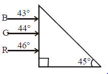 Figure shows a mixture of blue, green and red coloured rays incident normally on a right angled prism. The critical angles of the material of the prism for red, green and blue are 46°, 44° and 43° respectively. The arrangement will separate.