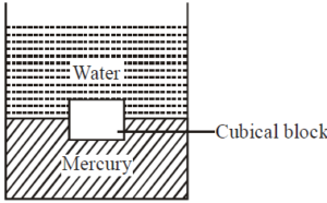 A tank contains water on top of mercury as shown in figure. A cubical block of side 10 cm is in equilibrium inside the tank. The depth of the block inside mercury is (RD of the material of block = 8.56, RD of mercury = 13.6)